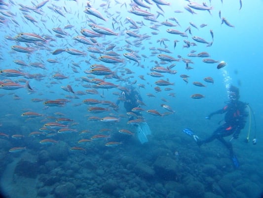 エントリー場所は浅く、その先は急勾配に。透明度がいい日は井田ブルーと言われる程海が青くとても気持ちがいい!魚影も濃く、特に夏~秋は魚影が濃い。イサキ、タカベの群れは圧巻!施設も綺麗で使い勝手が良く、女性更衣室も新しくなったのも魅力的!